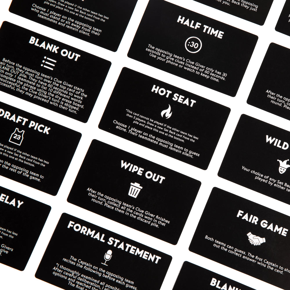 But beware! Each round both teams can wreak havoc by playing Set Backs. Things like – make your team's Clue Giver dance non-stop while giving clues, cancel points your team earned, or steal your team’s best player for the rest of the game. And many more!