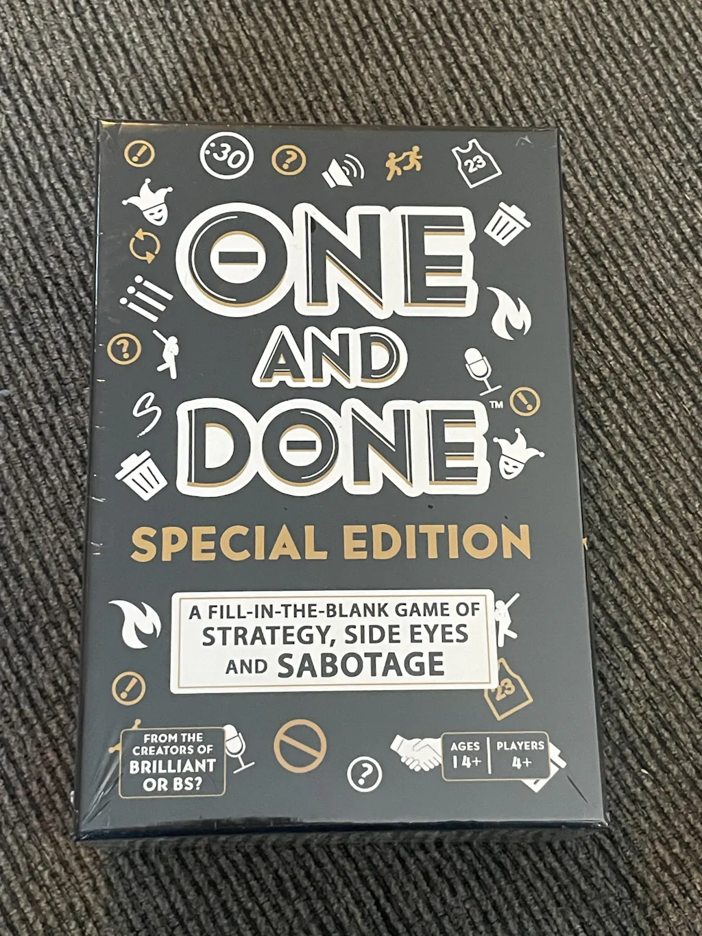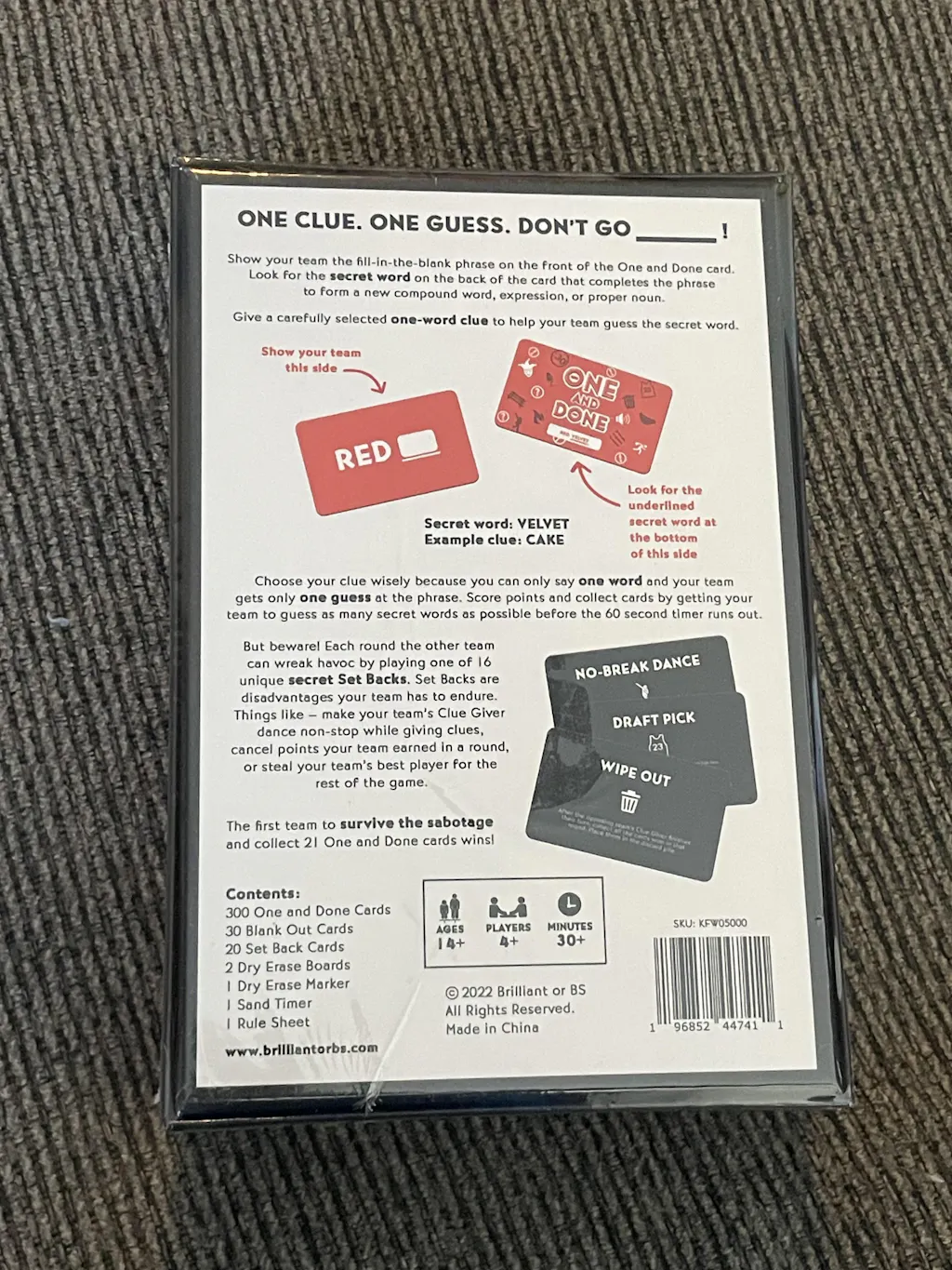 One and Done is a fast-paced word guessing party game with a dash of mischief and unpredictability. Give one word clues to help your team finish fill-in-the-blank phrases. But beware! The other team can be messy (and petty) by playing any of 16 unique sabotage cards called Set Backs. The first team to survive the sabotage wins.