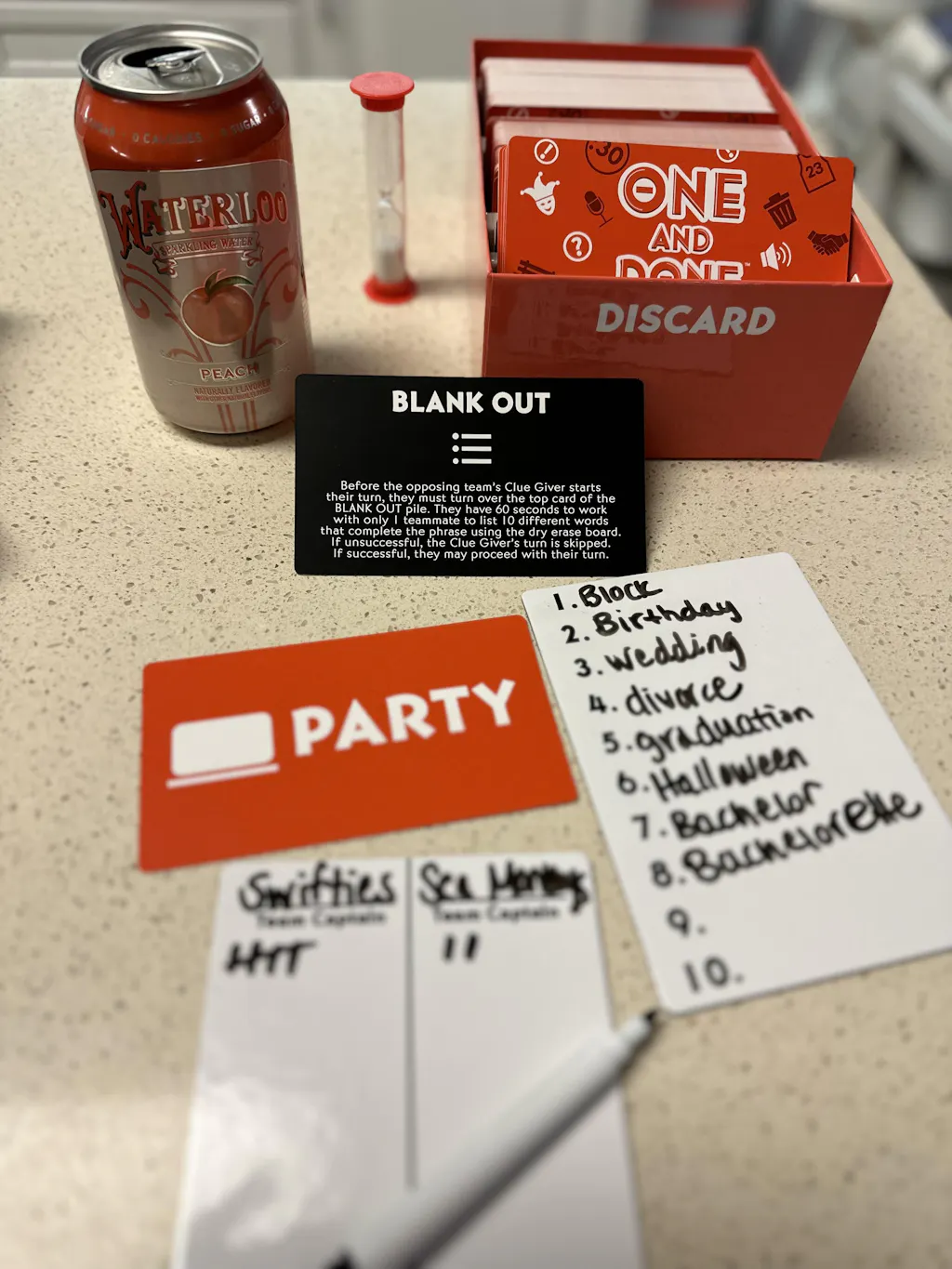 One and Done is a fast paced game of a one word clue to help your team fill in the blank. But watch out, the other team can play sabotages to break concentration or take and discard all your winning cards. The game comes with 300 one and done cards, 30 blank out cards, 20 set back cards, 2 dry erase marker boards, 1 dry erase marker and one sand timer. You see how many cards your team can guess in 60 seconds but the team playing the sabotages can really set you back. We had two teams of 4 and we played for about an hour. We will play this again at our weekly game nights.